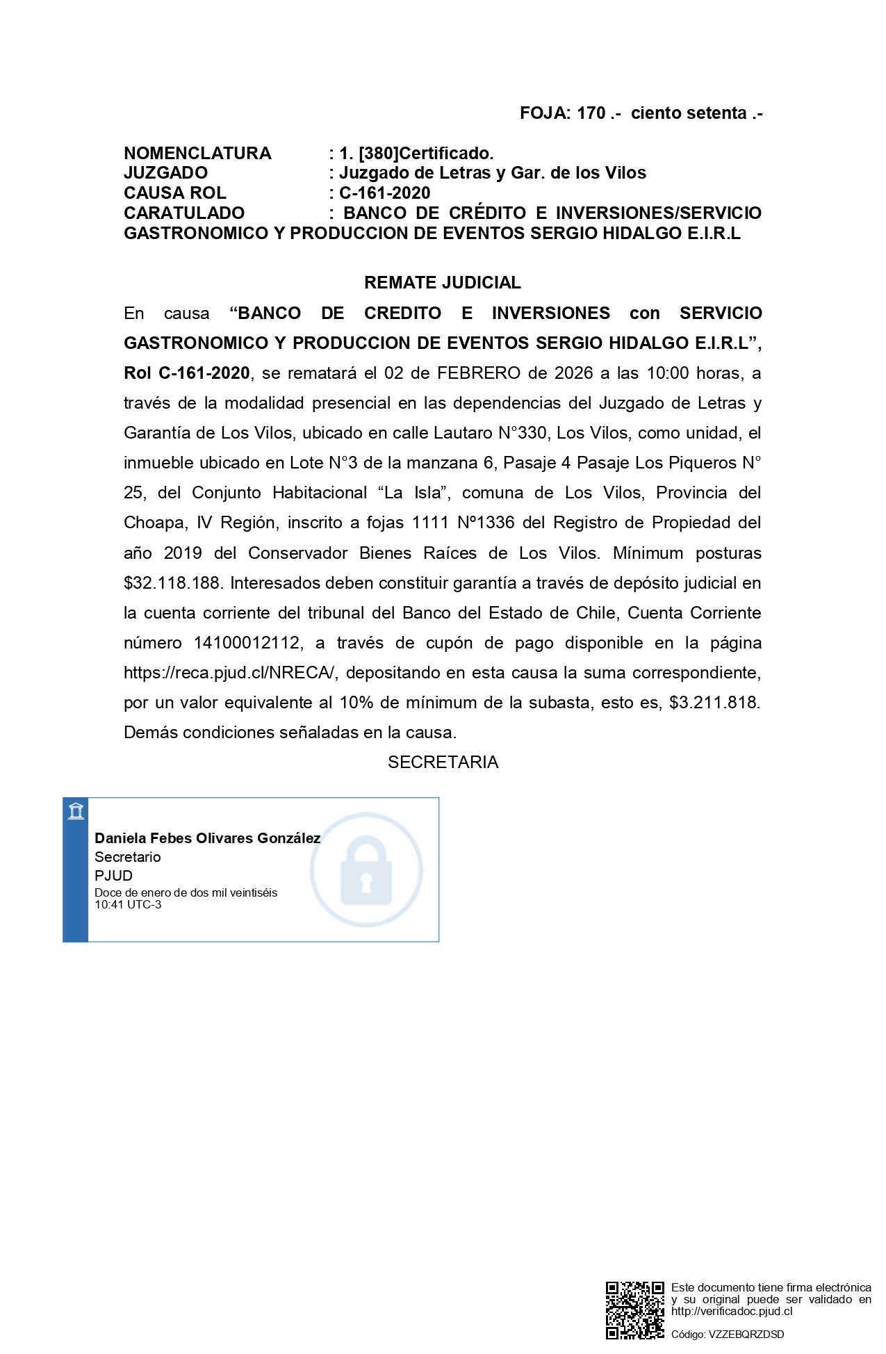 Remate. Inmueble en Lote N°3 manzana 6, Pasaje 4 Los Piqueros N° 25, Conjunto Habitacional “La Isla”, Los Vilos