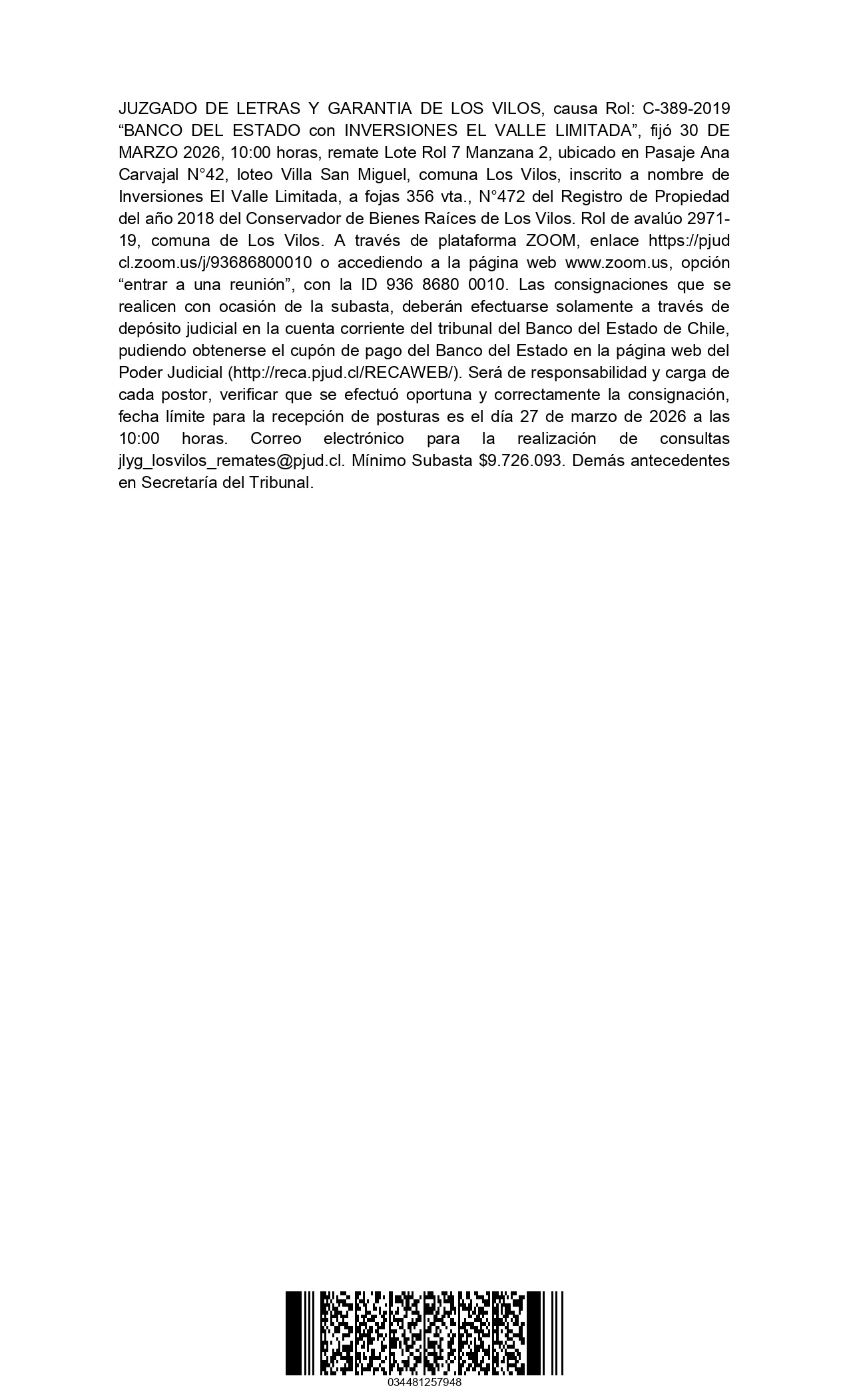 Remate. Lote Rol 7 Manzana 2, ubicado en Pasaje Ana Carvajal N°42, loteo Villa San Miguel, comuna Los Vilos.