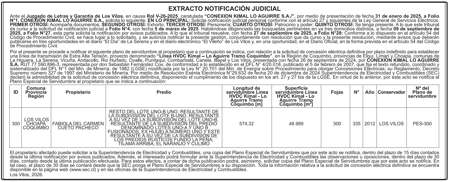 Notificación. Plano de servidumbre concesión eléctrica para línea de transmisión Extra Alta Tensión de proyecto “Línea HVDC Kimal – Lo Aguirre Tramo Coquimbo”. Causa Rol V-26-2025. Juzgado de Letras y Garantía de Los Vilos